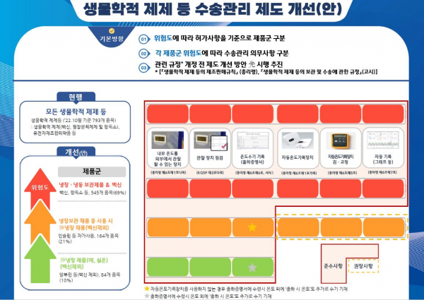 위험도에 따른 제품군 구별에 따라, 현재 모든 생물학적 제제 등에 동일하게 적용하던 자동온도기록장치 설치, 자동온도기록 등 수송 시 온도관리 의무사항을 앞으로 제품군별로 구분 적용한다.