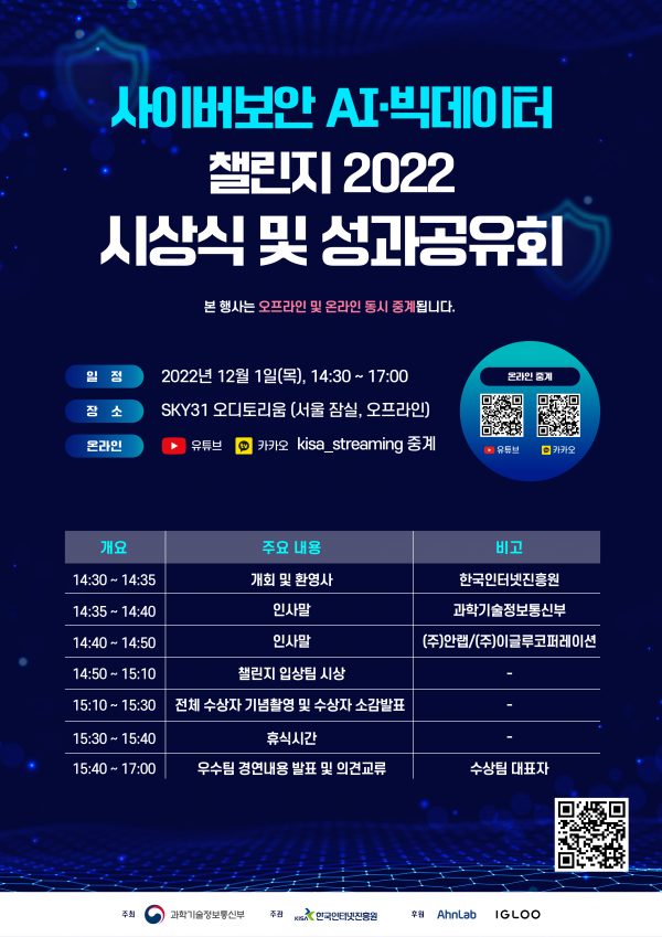 [세종타임즈] 과학기술정보통신부(장관 이종호, 이하 ‘과기정통부’)와 한국인터넷진흥원(원장 이원태, 이하 KISA)은 사이버보안 분야 AI·빅데이터 활용 대국민 관심도 제고를 위해 개최한 ‘사이버보안 AI·빅데이터 챌린지 2022’ 시상식과 우수성과 공유회를 2022.12.1.(목) 개최(장소 : 잠실 롯데타워SKY31 오디토리움) 했다.