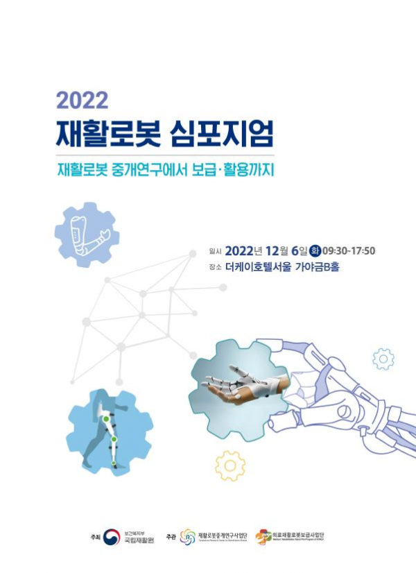 이번 심포지엄은 ‘재활로봇중개연구부터 보급에서 활용까지’라는 주제로‘2022 재활로봇중개연구 심포지엄’과 ‘2022 의료재활 로봇산업 활성화 심포지엄’이 함께 개최되며 국립재활원 재활로봇중개연구사업단과 의료재활로봇보급사업단이 공동으로 주관한다.