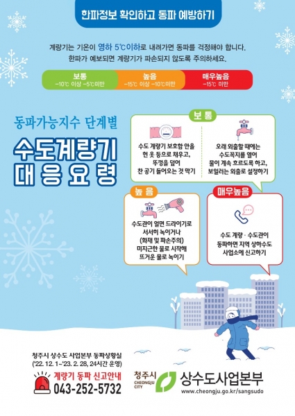시 관계자는 “수도계량기 동파예방법을 내년 2월까지 지속적으로 홍보해 시민 피해 최소화를 위해 노력할 예정”이라며 “수도계량기 동파 관련 문의와 신고는 ☎043-252-5732로 전화를 해주길 바란다”고 말했다.