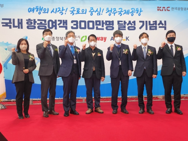 [세종타임즈] 청주시는 충청북도, 한국공항공사와 9일 청주국제공항 국제선 여객청사 1층에서 청주공항 국내선 연간 이용객 300만명 달성 기념행사를 개최했다고 밝혔다.