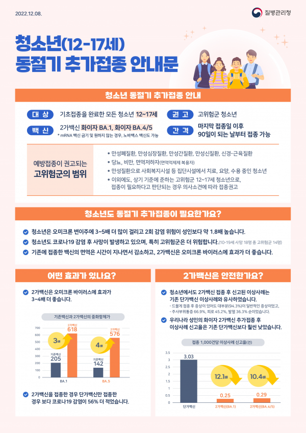 이번 결정은 ➊식약처 2가백신 허가 접종연령, ➋국외 주요국의 2가백신 청소년 접종 현황 등을 고려했다.