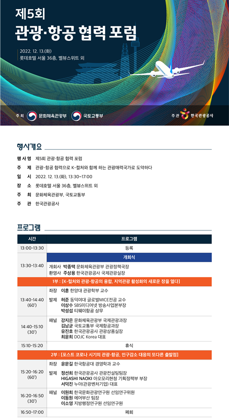 [세종타임즈] 문화체육관광부는 국토교통부와 함께 12월 13일 오후 1시 30분 롯데호텔 서울에서 ‘2022 관광·항공 협력 포럼’을 열어 한국문화를 활용한 외국인 관광객 유치 활성화 방안 등을 논의한다.