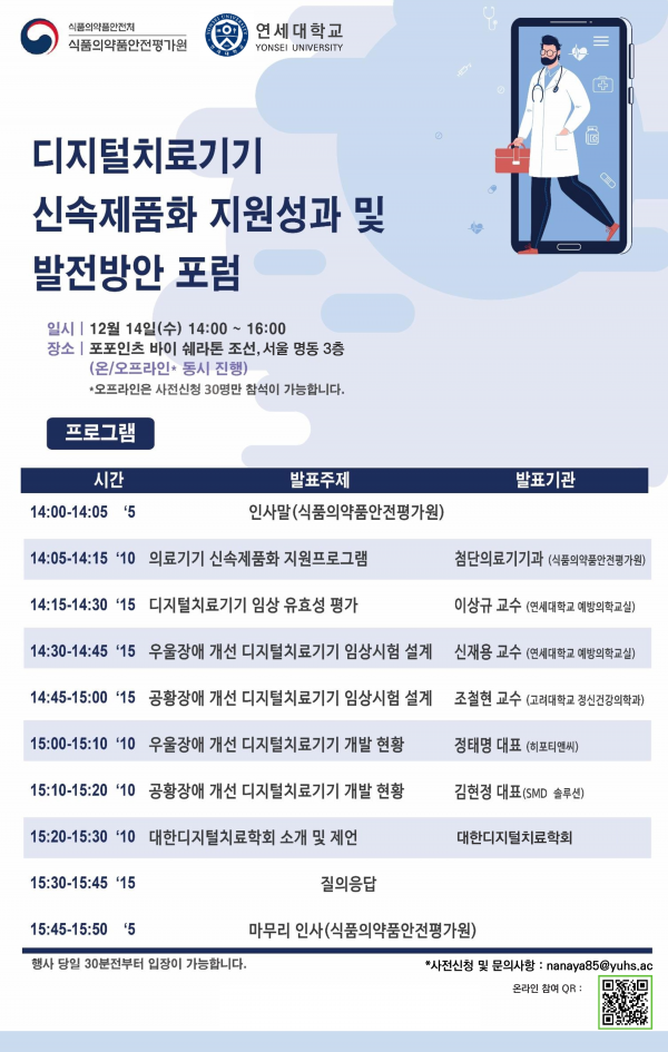 포럼의 주요 내용은 디지털치료기기의 성능·안전성 평가 방법과 임상적 유효성 평가 방법 안내 디지털치료기기 개발 현황 공유 디지털치료기기 제품화 지원 사례와 성과 소개 임상시험 지원 방안 논의 등이다.