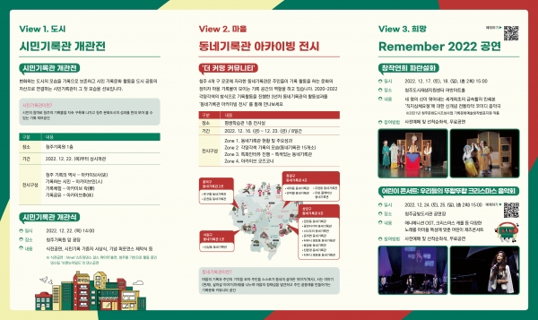 올해 기록문화주간의 주제는 기록보관을 의미하는 아카이브와 시점을 뜻하는 뷰를 더한 [아카이뷰]로 View1. 도시 View2. 마을 View3. 희망 View4. 상생 View5. 공감, 다섯 가지 테마로 청주 전역에서 전시와 공연, 네트워킹이 펼쳐진다.