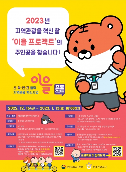 [세종타임즈] 문화체육관광부와 한국관광공사는 신규 지역관광 콘텐츠발굴과 산·학·연·관 협력 생태계 조성을 위한 ‘이을 프로젝트’ 공모전을 이달 16일부터 내년 1월 13일까지 실시한다.