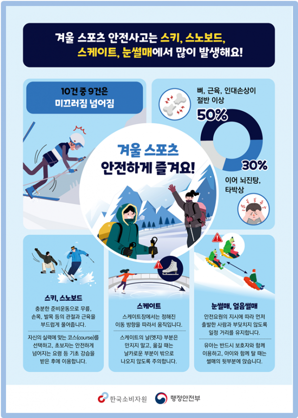 행정안전부와 한국소비자원은 “겨울 스포츠를 즐길 때는 자신의 실력에 맞는 코스를 선택하고 무엇보다 무리하지 않는 것이 중요하며 특히 안전모와 보호대 등 안전장구도 꼼꼼히 챙겨 불의의 사고를 예방해야 한다”고 전했다.