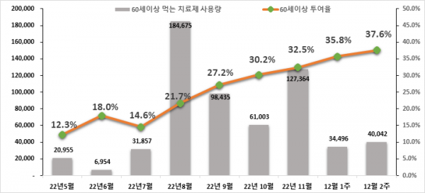 12월 2주차 60세 이상 환자에 대한 먹는 치료제 평균 처방률은 37.6%로 지난주 대비 1.8%p 증가했다.