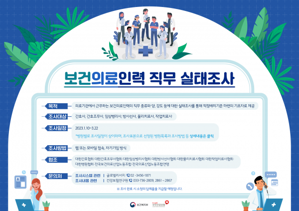 보건복지부 장재원 의료인력정책과장은 “보건의료인력과 관련해 적정 인력기준을 마련해야 한다는 사회적 요구가 커지고 있으나, 정작 보건의료인력의 정확한 근무실태는 파악하지 못한 한계가 있었다”며 “이번 조사가 보건의료직종별로 정확한 근무실태를 파악해 향후 적정 인력 기준 논의의 중요한 밑거름이 마련될 것으로 기대한다”고 하고 성공적인 조사를 위해 조사대상 병원과 대상인력이 조사에 적극적으로 참여해 줄 것을 당부했다.