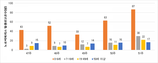 전국 208개 표본감시기관 감시체계의 환자 감시현황에 따르면, ’22년 51주에 노로바이러스 감염으로 신고된 환자 수는 총 156명으로 최근 5주간 신고건수가 지속 증가하고 있다.
