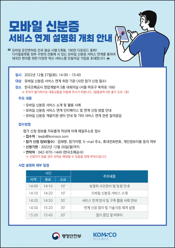 행정안전부는 12월 27일 한국조폐공사 서울 사옥에서 기업과 공공기관을 대상으로 ‘모바일 신분증 서비스 연계 설명회’를 개최한다고 밝혔다.
