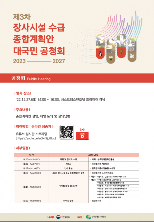 이번 공청회는 보건복지부 주철 노인지원과장의 제3차 장사시설 수급 종합계획 발표를 시작으로 엄기욱 군산대학교 사회복지학과 교수를 좌장으로 하고 장사계, 법학, 홍보 및 소비자 등 다양한 분야의 총 8명의 토론자를 모시고 장사시설 수급 종합계획의 주요 정책 추진 방향에 대한 토론을 진행한다.