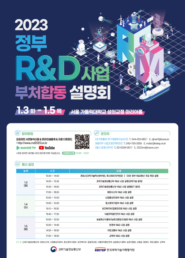 [세종타임즈] 과학기술정보통신부는 정부연구개발 사업을 수행하는 13개 중앙행정기관과 합동으로 “2023년도 정부연구개발사업 부처합동설명회”를 1월 3일부터 5일까지 서울 가톨릭대학교 성의교정에서 개최한다고 밝혔다.