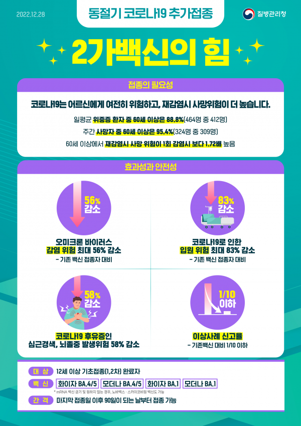 지영미 청장은, “60세 이상과 요양병원·시설 등 감염취약시설 거주자·입소자는 동절기 추가접종을 통한 예방이 무엇보다 중요하다”고 밝히며 “최근 위중증 환자 및 사망자 증가, 중국의 불확실한 유행상황 등을 고려, 나 자신과 가족, 이웃의 안전과 건강을 지킬 수 있도록, 동절기 추가접종에 적극 참여해주실 것”을 당부했다.
