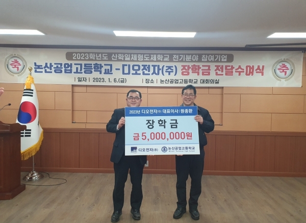 [세종타임즈] 논산공업고등학교는 1월 6일 산학일체형 전기분야 도제교육기관인 디오전자로부터 작년에 이어 올해도 장학금 500만원을 기탁받았다.