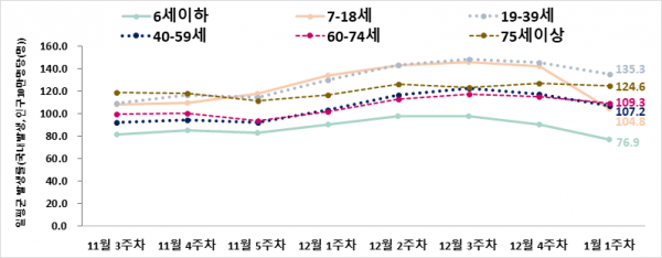 전 연령대에서 전주 대비 일평균 발생률이 감소했다.