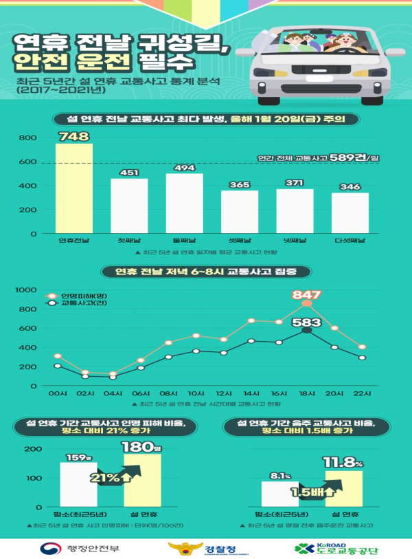 아울러 올 설 연휴가 포함된 1월은 도로에 눈이나 서리 등이 얼어붙으며 발생하는 도로 결빙 교통사고가 가장 많이 발생하는 시기로 도로 주행 중에는 차 간 거리를 잘 지키고 안전운전에 유의하도록 한다.