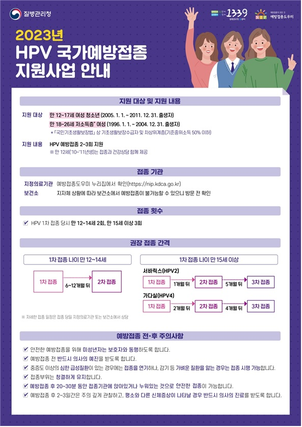 질병관리청은 만 12~17세 여성 청소년과 만 18~26세 저소득층 여성에게 무료로 예방접종을 맞을 수 있도록 지원하고 있으며 사람유두종바이러스 국가예방접종 지원 대상자는 가까운 지정 의료기관 및 보건소에 방문해 접종을 맞을 수 있다.