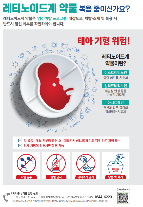 이번에 강화된 내용은 제품 용기·포장에 ‘제품 사용 전·후 일정 기간 피임 필수’ 등 주의 문구 기재·강조 환자 동의서 환자용·전문가용 설명서 가독성 개선 환자 설명서 등 확인 쉽도록 제품에 QR코드 삽입 정보 접근성 향상 위한 레티노이드 제제 정보 누리집 개편 처방 병·의원에 관련 안전사용 포스터 배포이다.