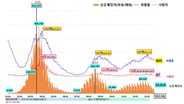 최근 ’23년 1월 2주차 주간 일평균 확진자 수는 42,938명으로 이는 전주 대비 확진자 16,293명, 사망자 44명이 감소된 수치이며 1월 19일자 기준으로 일일 신규 확진자 수는 지난 8주간 최저수치인 29,816명을 기록해 동절기 유행은 점차 감소 추세임을 알 수 있다.
