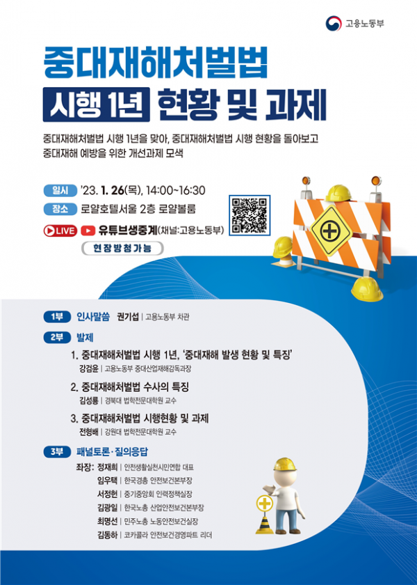 [세종타임즈] 고용노동부는 1월 26일 오후 2시, 중대재해처벌법 시행 1년 현황 및 과제를 주제로 토론회를 개최했다.