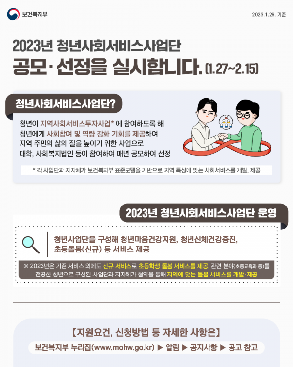 [세종타임즈] 보건복지부는 2023년 청년사회서비스사업단선정·운영을 위해 1월 27일부터 2월 15일 약 3주간 전국 17개 시·도를 대상으로 청년사업단 공모를 실시한다고 밝혔다.