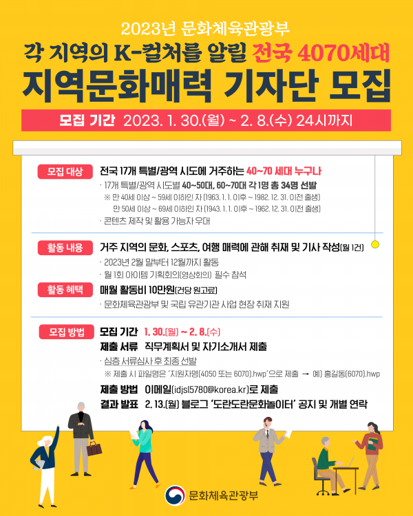 [세종타임즈] 문화체육관광부는 전국 각 지역의 문화 매력을 SNS를 통해 알릴 4070세대 기자단을 1월 30일부터 2월 8일까지 공모해 총 34명을 선발한다.