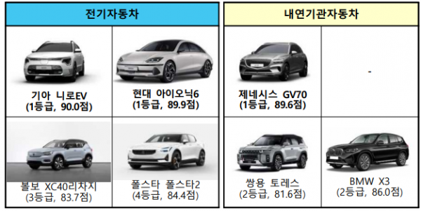 기아 니로EV, 현대 아이오닉6, 제네시스GV70은 충돌안전성, 외부통행자안전성, 사고예방안전성전반에서 좋은 점수를 얻으면서 1등급을 받았다.