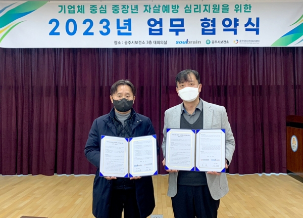 솔브레인 사업장 근로자의 정신건강 증진, 자살예방 교육, 정기적인 정신건강 검진을 위해 마련된 이번 협약은 공주시정신건강복지센터 주관으로 공주시보건소, 솔브레인 등 3개 기관이 참여했다.