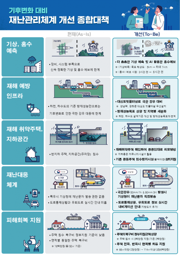 최종적으로 기상·홍수 예측 역량 제고 재해 예방 기반 확충, 재해취약주택 및 지하공간 침수 방지, 신속한 대응체계 구축, 피해회복 지원 강화 등 5대 추진전략을 확정하고 추진해 나가고 있다.