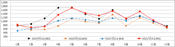 이는 ’21년 1,146만4천명 보다 22% 증가한 수준으로 지난해 4월 거리두기 해제로 섬 지역 여행객이 대폭 증가했기 때문이다.