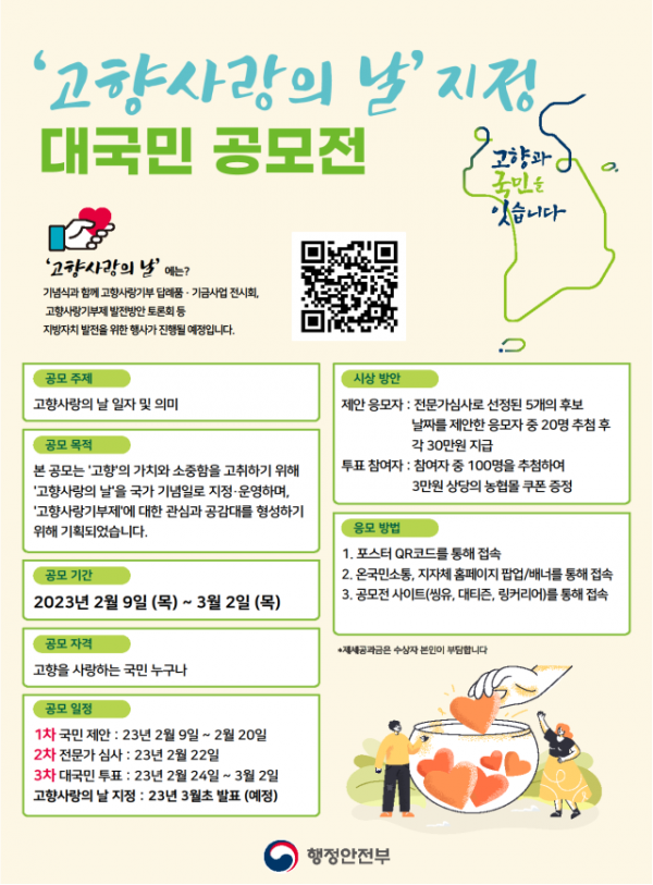 [세종타임즈] 행정안전부는 고향의 가치와 소중함을 되새기고 고향사랑기부제 활성화를 위해 2월 9일부터 3월 2일까지 대국민 공모를 실시해 ‘고향사랑의 날’을 지정한다고 밝혔다.