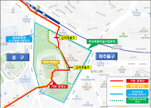 인천광역시는 숭의운동장 도시개발사업지구내 주상복합아파트 단지가 중구와 미추홀구 관할로 나누어져 발생하는 주민 불편을 해소하기 위해 관련 지자체 공무원·의원·주민·전문가 등이 참여한 ‘경계변경자율협의체’를 구성·운영해 미추홀구 관할구역으로 경계를 조정했다.