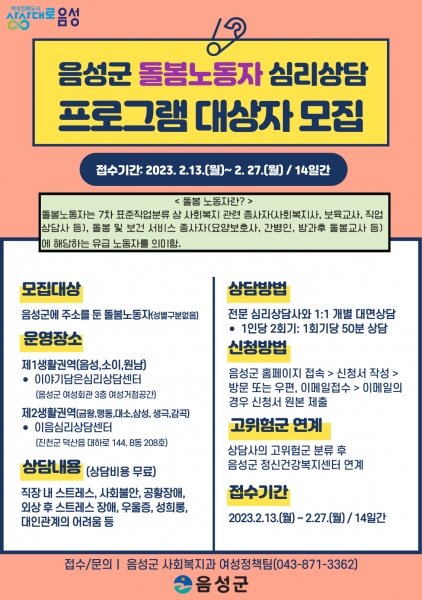 모집대상은 음성군에 주소를 둔 돌봄노동자이며 상담내용은 직장 내 스트레스, 사회불안, 공황장애, 외상 후 스트레스 장애, 대인관계의 어려움, 우울증, 성희롱 등이다.