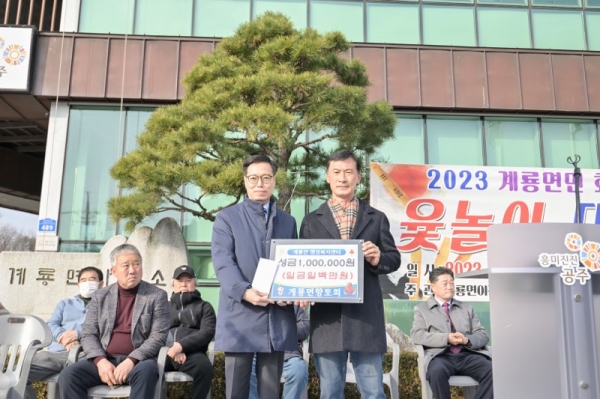김만중 계룡면장은 “모두가 어려운 시기에 나보다 더 어려운 이웃들에게 관심을 가지고 성금을 기탁해 준 계룡면향토회 회원들께 감사드린다 보내주신 성금은 취약계층에 난방유를 지원해 따뜻한 겨울을 보낼 수 있도록 하겠다”고 전했다.