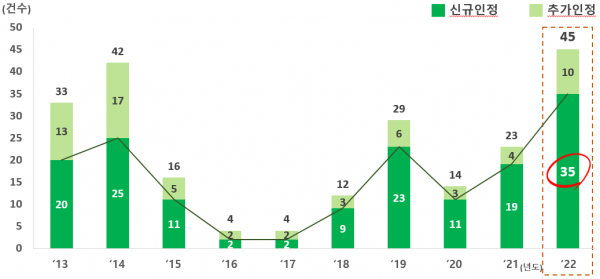 [세종타임즈] 식품의약품안전처는 2022년 건강기능식품 기능성 원료 인정 현황을 분석한 결과, 인정 원료는 총 45건으로 전년 대비 약 2배 증가했고 이 중 새롭게 인정된 기능성 원료는 35건으로 최근 10년 동안 가장 많은 원료를 인정했다고 발표했다.