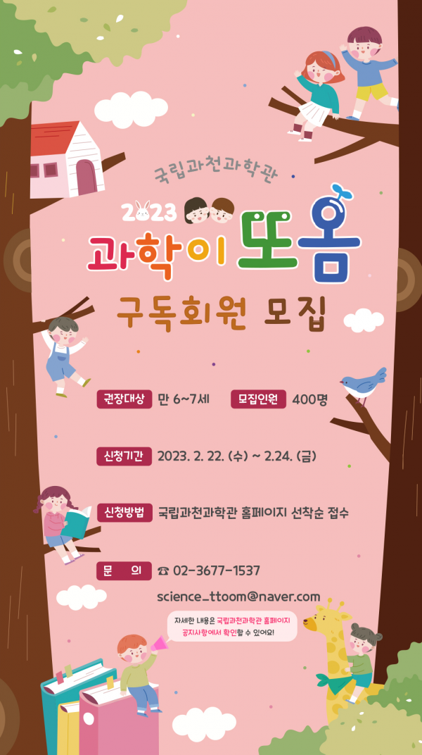 과학이 또옴의 상반기 정기구독 접수는 2월 22일부터 국립과천과학관 누리집을 통해 선착순으로 진행되며 하반기 정기구독 모집은 8월 중에 실시할 예정이다.