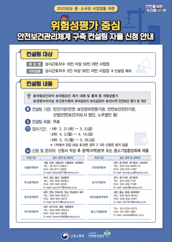 컨설팅 신청 기간은 ’23. 2. 21.∼’23. 3. 3.이며 한국산업안전보건공단 광역본부와 중소기업중앙회에 방문·우편·팩스·전자우편으로 신청할 수 있다.