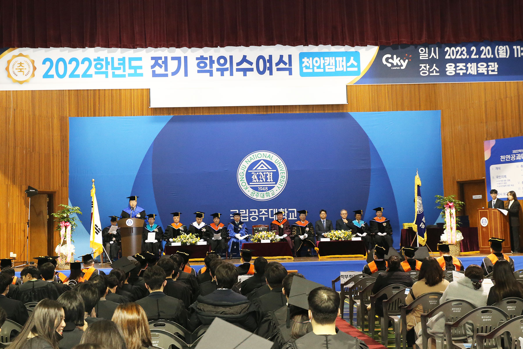 [세종타임즈] 국립공주대학교 천안공과대학은 20일 용주체육관에서 원성수 총장을 비롯한 졸업 동문 이영근 박사(前 미래산업(주) 회장), 천안시부시장(신동헌)과 학무위원, 천안공과대학 학과장, 졸업생 및 교직원, 재학생 등 내외빈이 참석한 가운데 2022학년도 전기 학위수여식 행사를 거행했다. 천안캠퍼스 천안공과대학은 이날 박사 16명, 석사 95명, 학사 871명 등 총 982명을 배출했다.