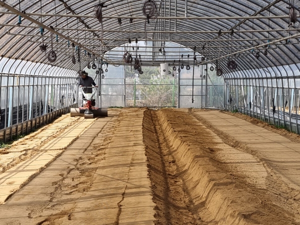 로터리 작업 후 하우스 내 모든 부위가 평편해야 관수 시 고르게 토양에 퍼지게 되므로 비닐 멀칭 전 정지작업을 한다.
