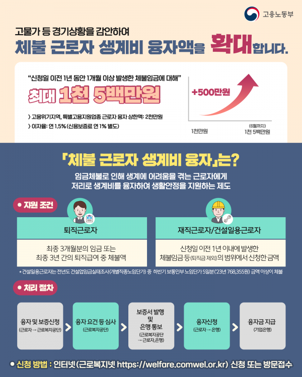 [세종타임즈] 고용노동부는 고물가·고금리·고환율, 불안정한 국제정세 등에 따른 경기침체로 중소·영세업체 근로자의 임금체불 확산이 우려됨에 따라, 민생경제의 조속한 안정을 위해 임금등 체불 근로자 생계비 융자금액을 4개월간 한시적으로 1인당 1천만원에서 1천5백만원으로 상향했다.