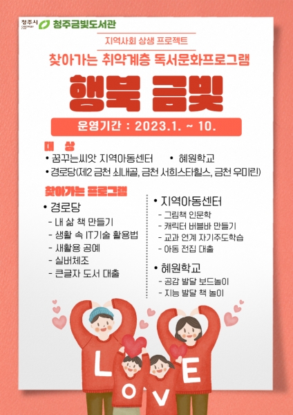 [세종타임즈] 청주금빛도서관이 오는 3월부터 금천동 지역 내 문화취약계층을 찾아가는 문화나눔 독서서비스 ‘행북 금빛 프로젝트’를 추진한다고 22일 밝혔다.