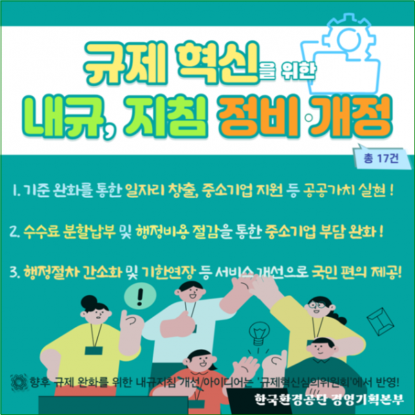 [세종타임즈] 환경부 산하 한국환경공단은 규제 혁신을 위한 내규 및 지침 정비에 나서 지난해 한 해 동안 총 17건의 개정을 통해 중소기업 대상 지원 확대 및 부담 감경, 국민 편의를 높였다고 밝혔다.
