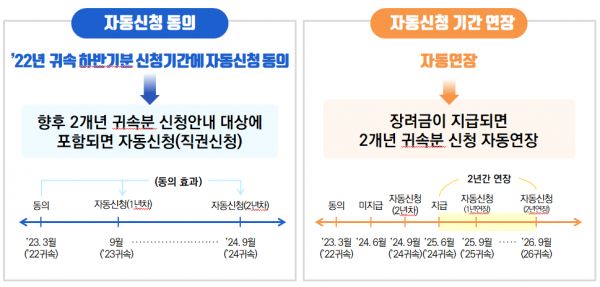 장려금 신청 대상인 고령자 등이 자동신청에 동의한 경우 향후 2년 내 신청 대상에 포함되면, 별도로 장려금을 신청하지 않아도 된다.