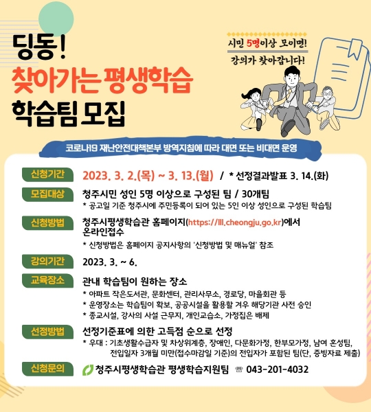 [세종타임즈] 청주시평생학습관은‘딩동 찾아가는 평생학습’상반기 학습자를 모집한다고 27일 밝혔다.