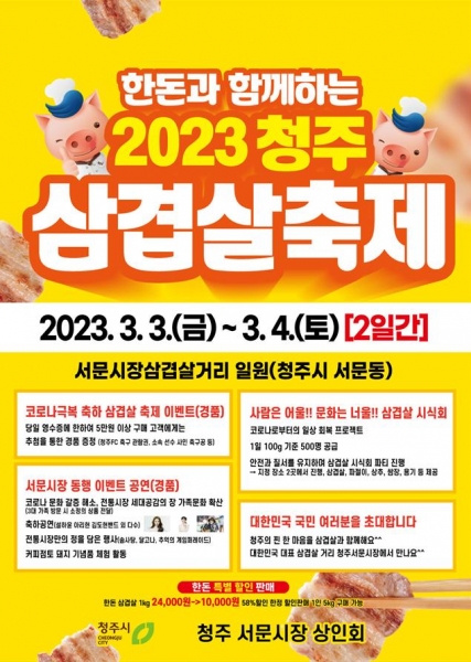 [세종타임즈] 청주서문시장상인회는‘한돈과 함께하는 2023 청주삼겹살 축제’를 오는 3월 3일부터 4일까지 이틀간 서문시장 삼겹살거리에서 개최한다고 밝혔다.