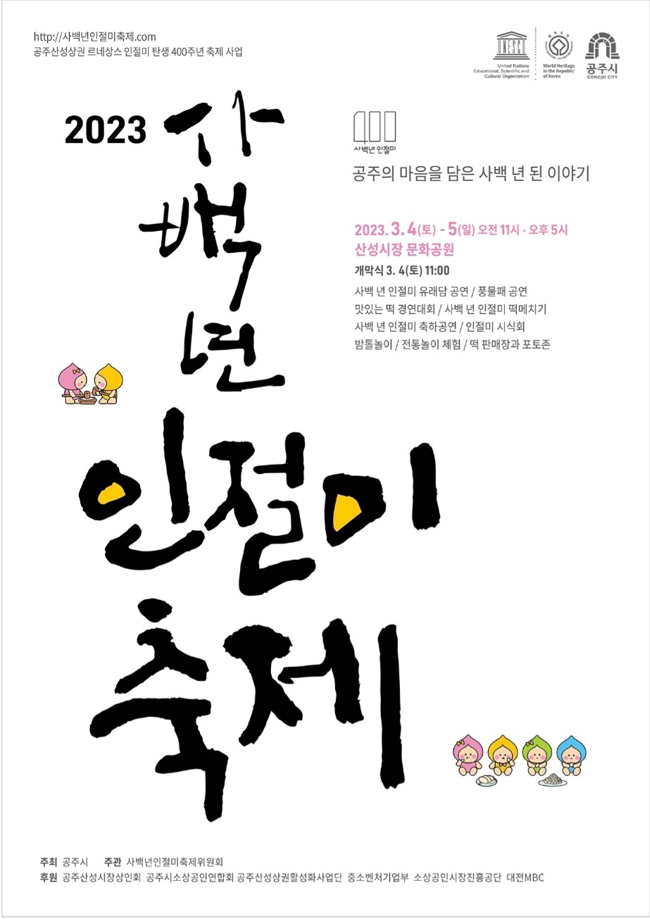 [세종타임즈] 공주시는 산성시장문화공원에서 3.4~3.5 오전11시부터 오후5시까지 2023'사백년인절미축제를 개최한다