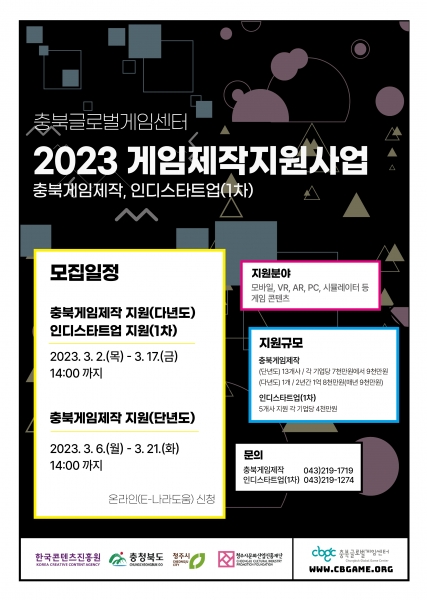 청주시가 지원하고 청주시문화산업진흥재단이 운영하는 충북글로벌게임센터가 2023 게임 제작지원사업에 참여할 게임기업 모집에 들어갔다.