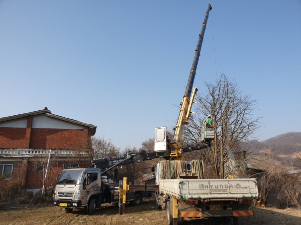 이날 작업에는 스카이 1대와 크레인 1대, 포크레인 1대의 장비가 투입됐다.