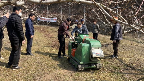 시연회에서는 농업기술센터 농기계임대사업소에서 임대하는 자주식 파쇄기의 작동 방법을 소개하고 동계전정한 잔가지를 농가들이 직접 파쇄해보는 시간을 가졌다.